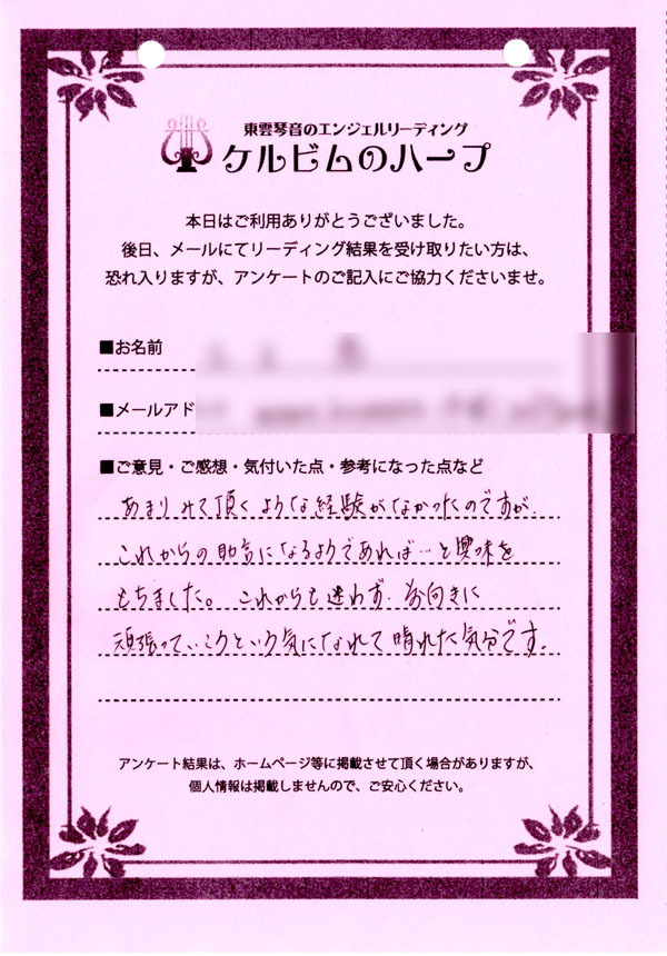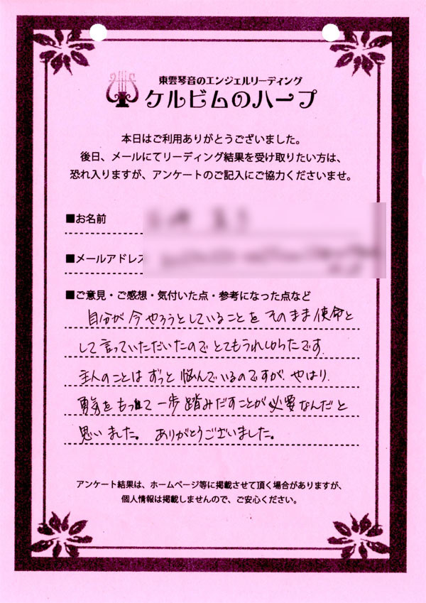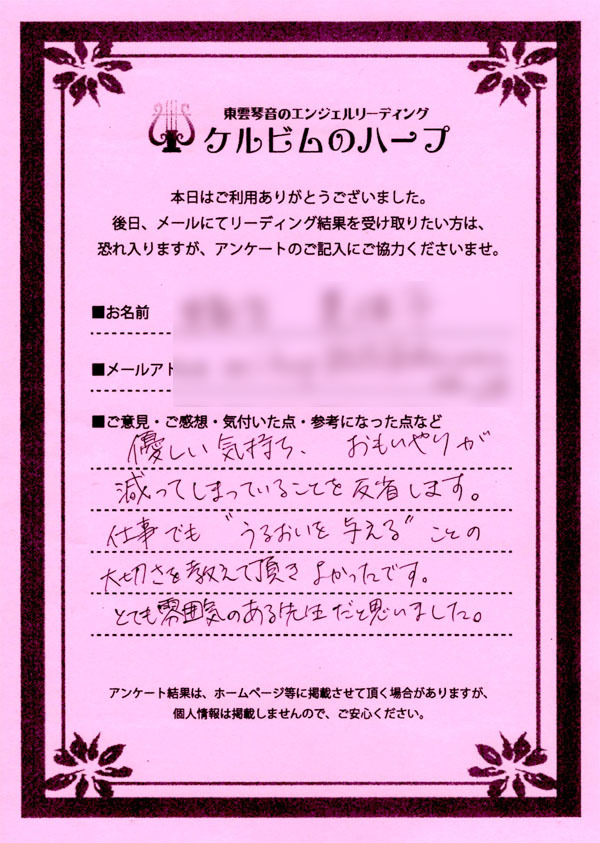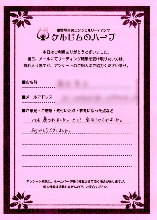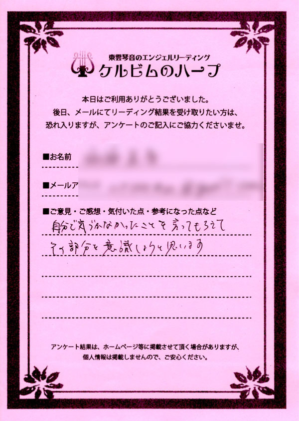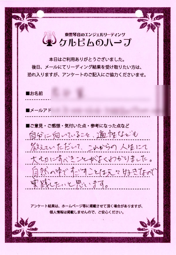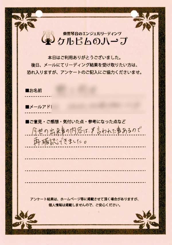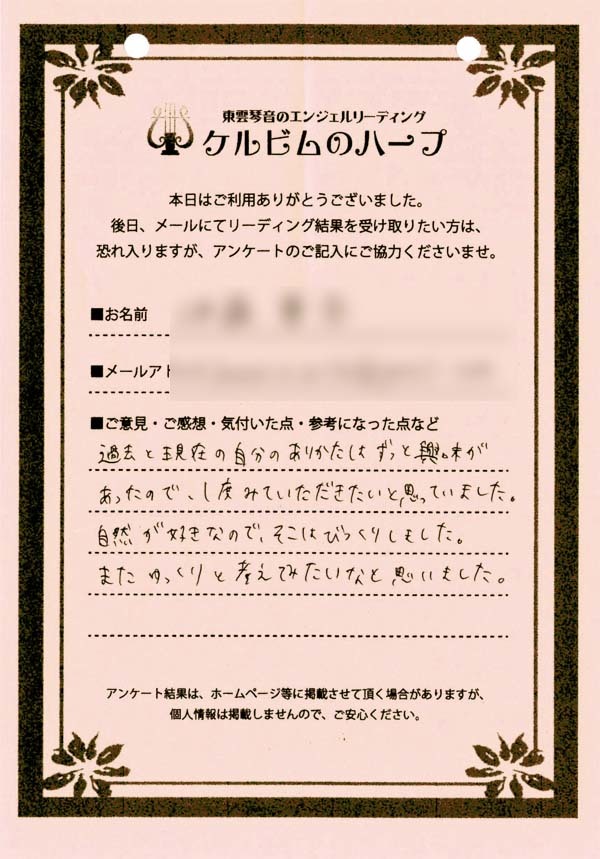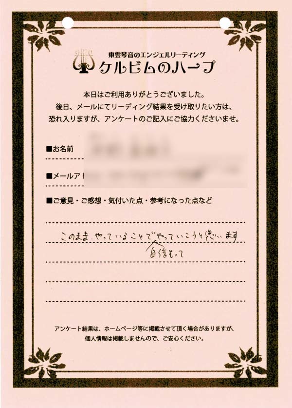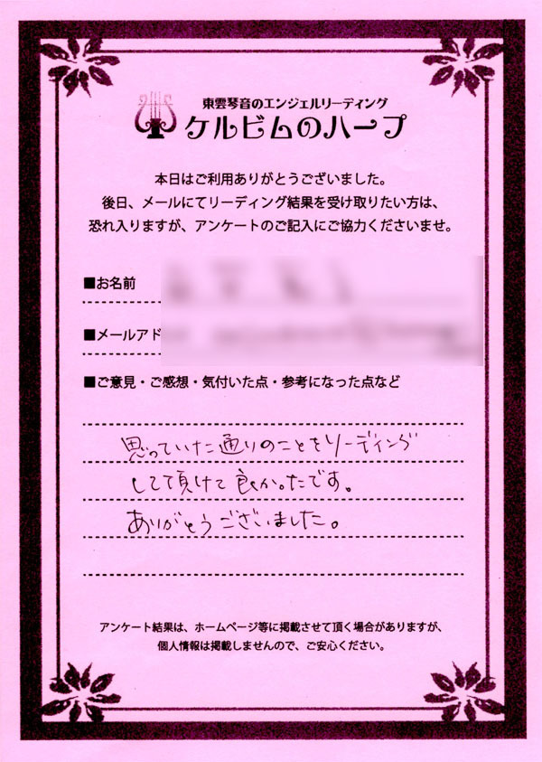 リーディング結果は、希望者のみ、メールにて内容をお送りするサービスを付加したのですが、ほとんどのご依頼者様がメール送付を希望されましたので、後日、メールをお送りして終了となりました。